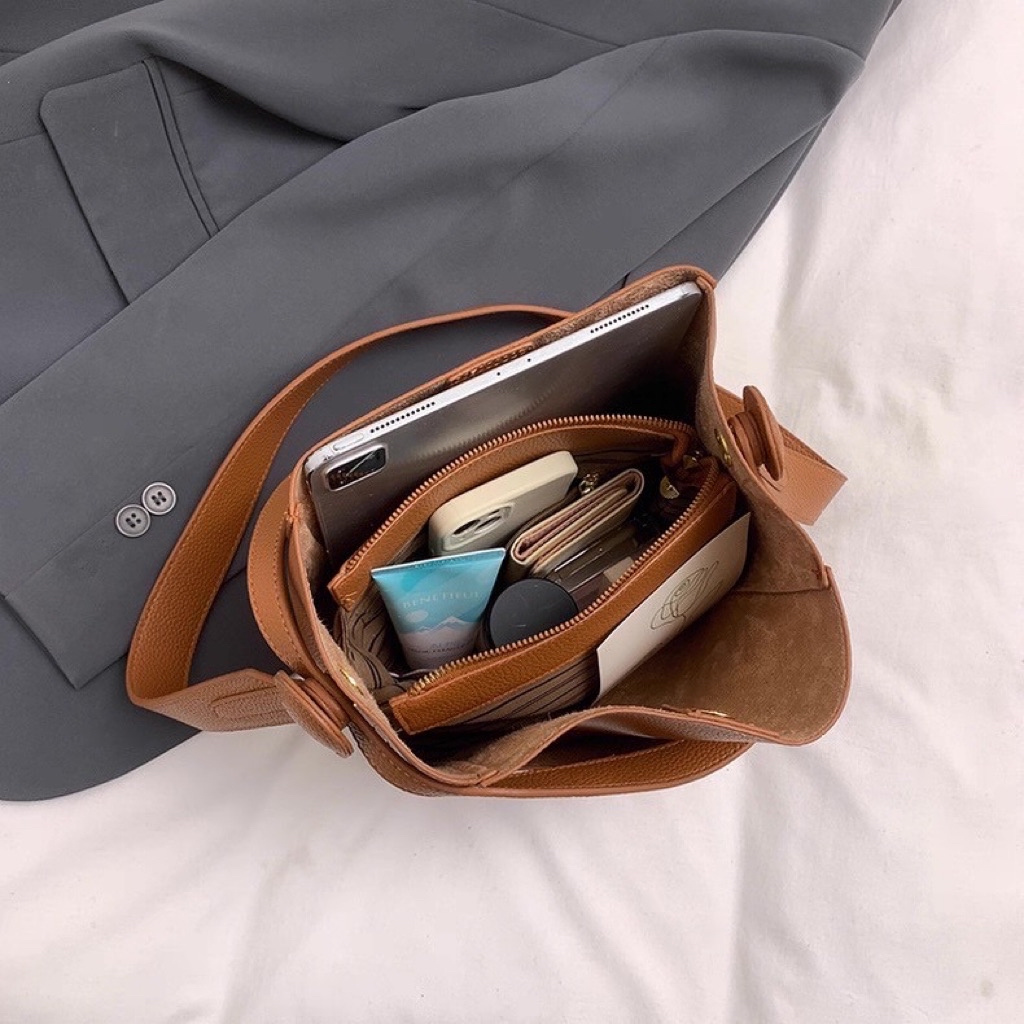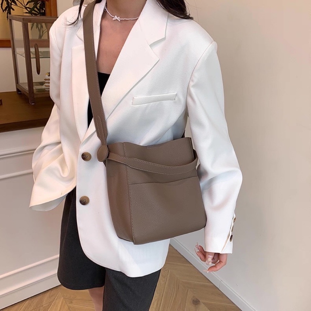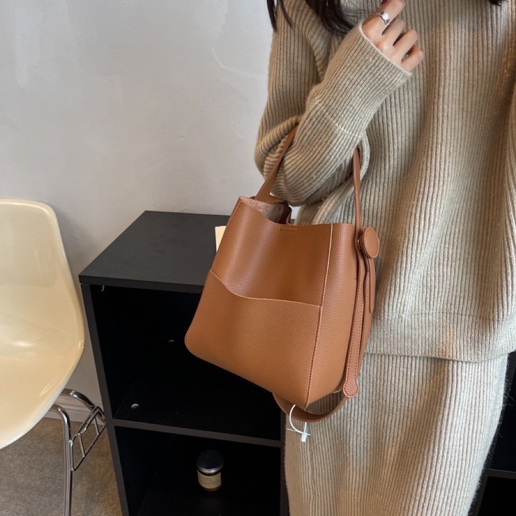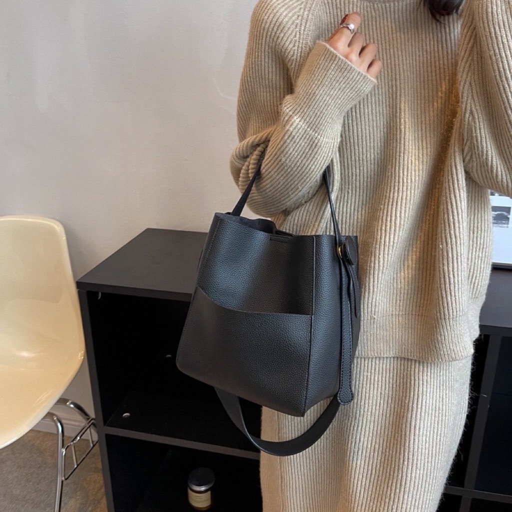 🔸復古簡約軟皮單肩大容量百搭通勤水桶包