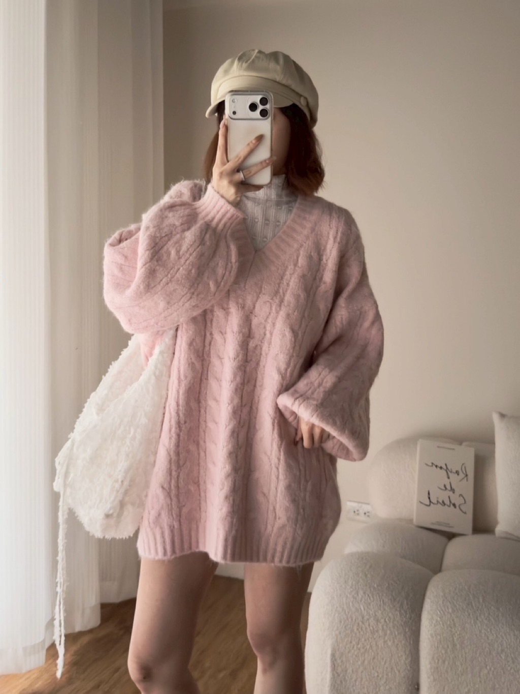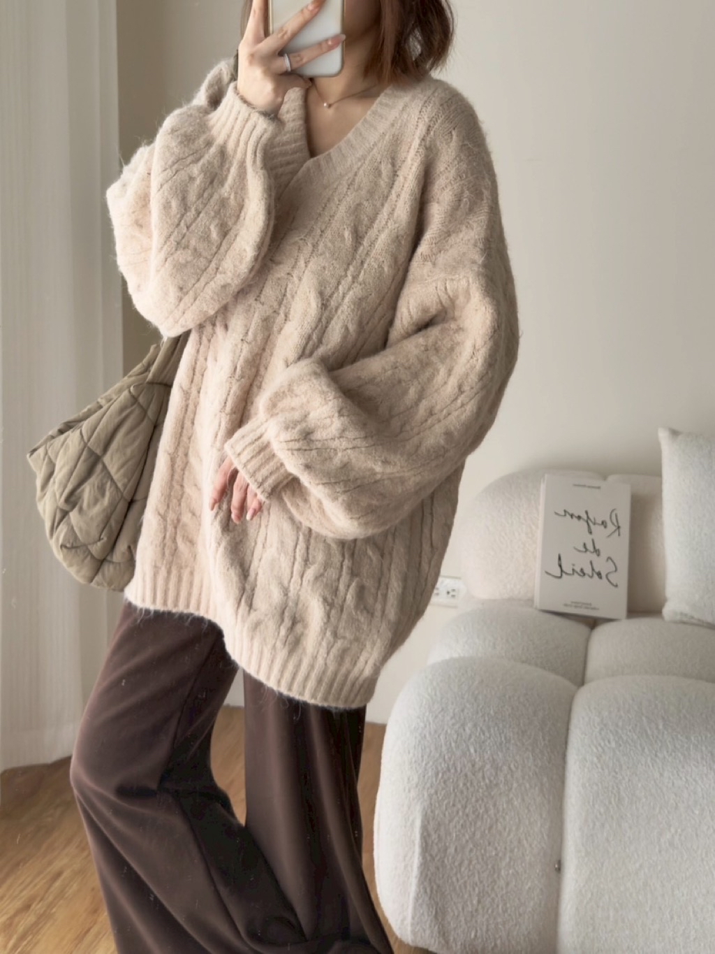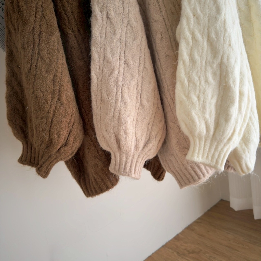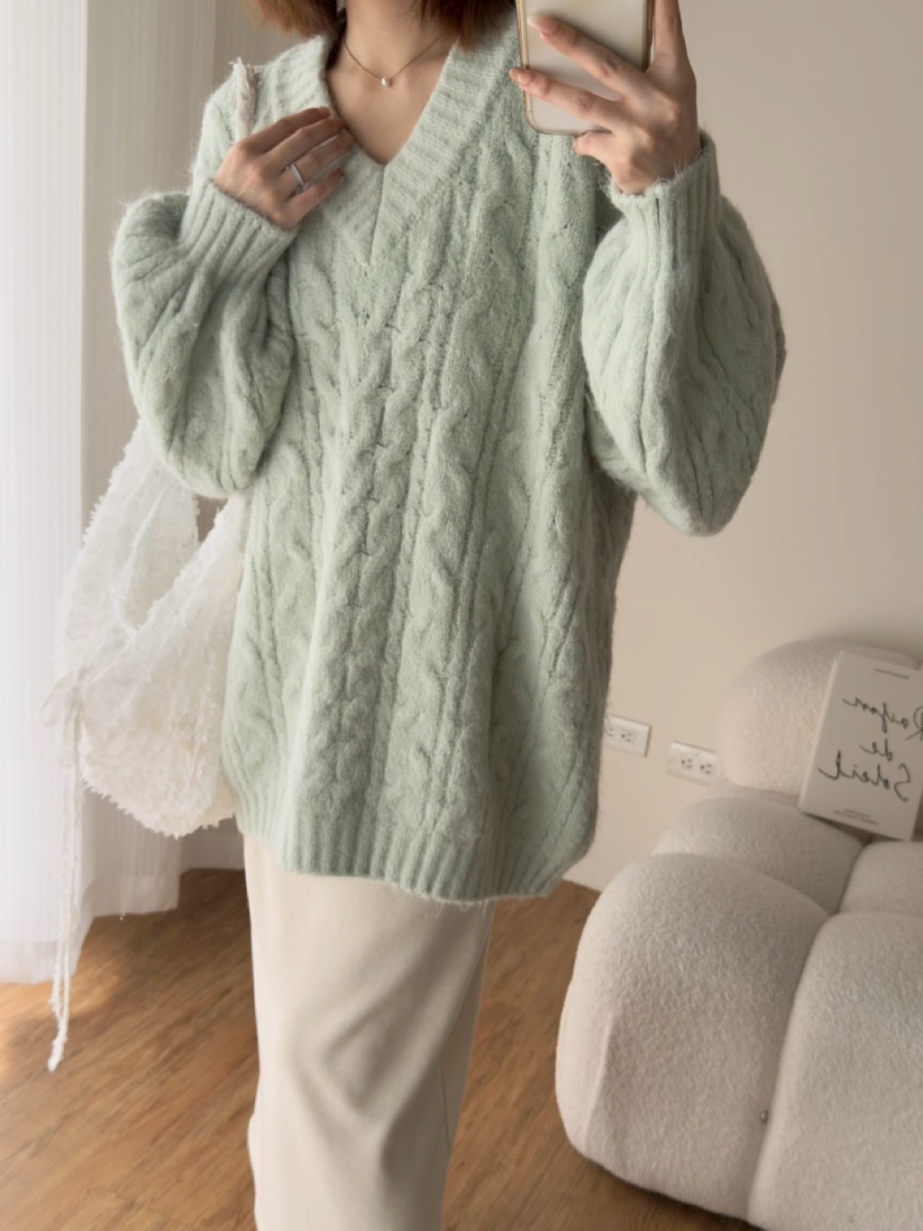 ʀ.ᴄʜ 大版花苞袖V領麻花毛衣