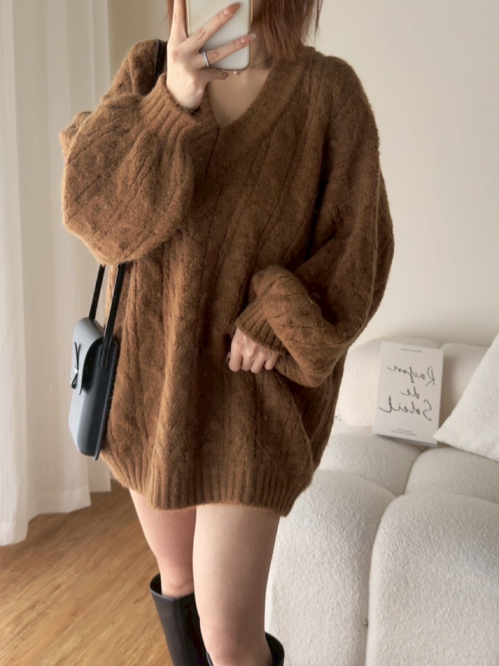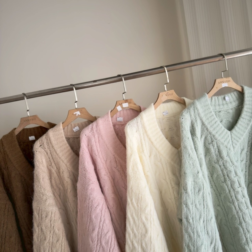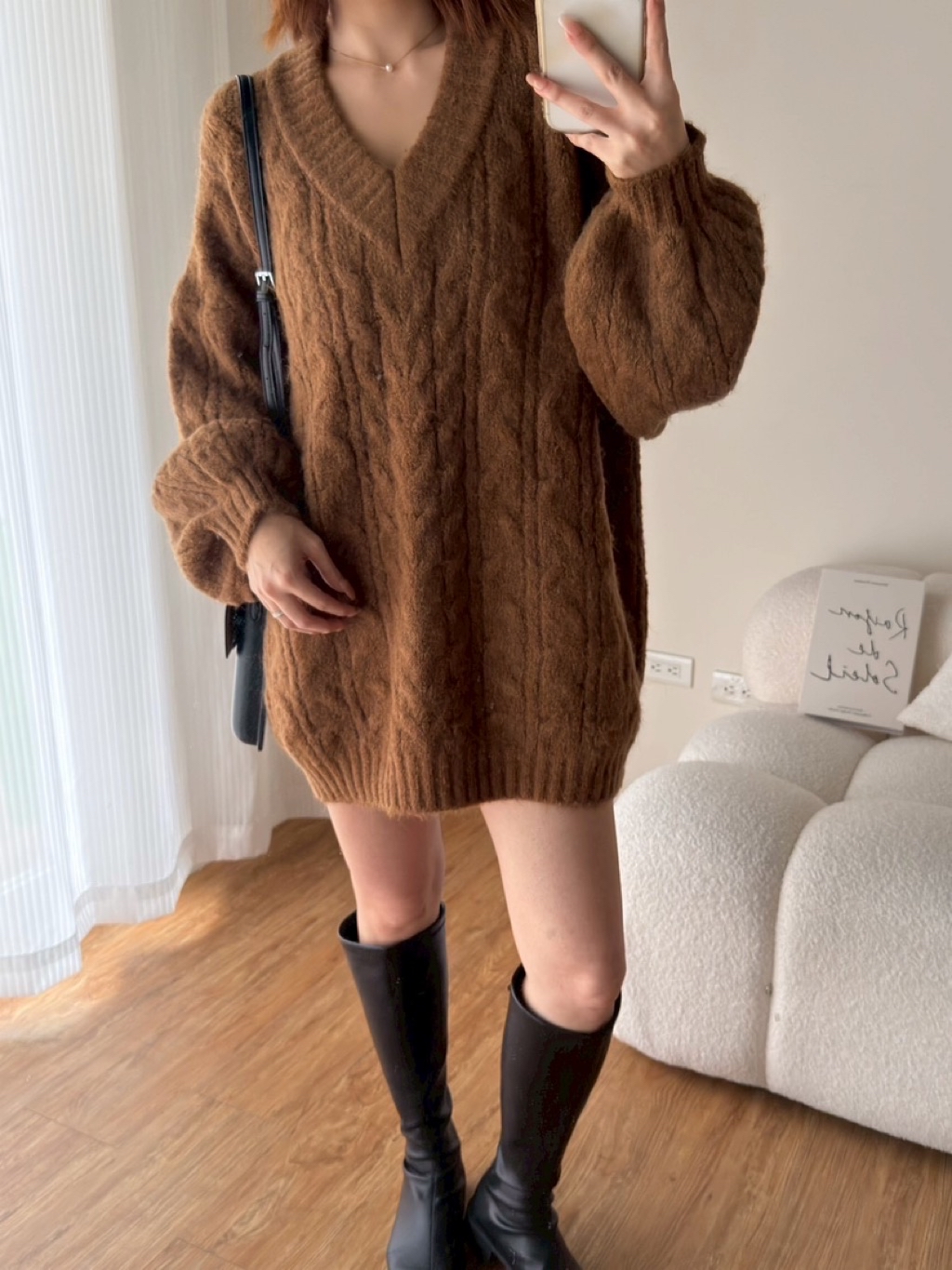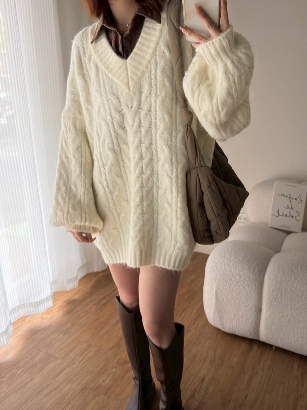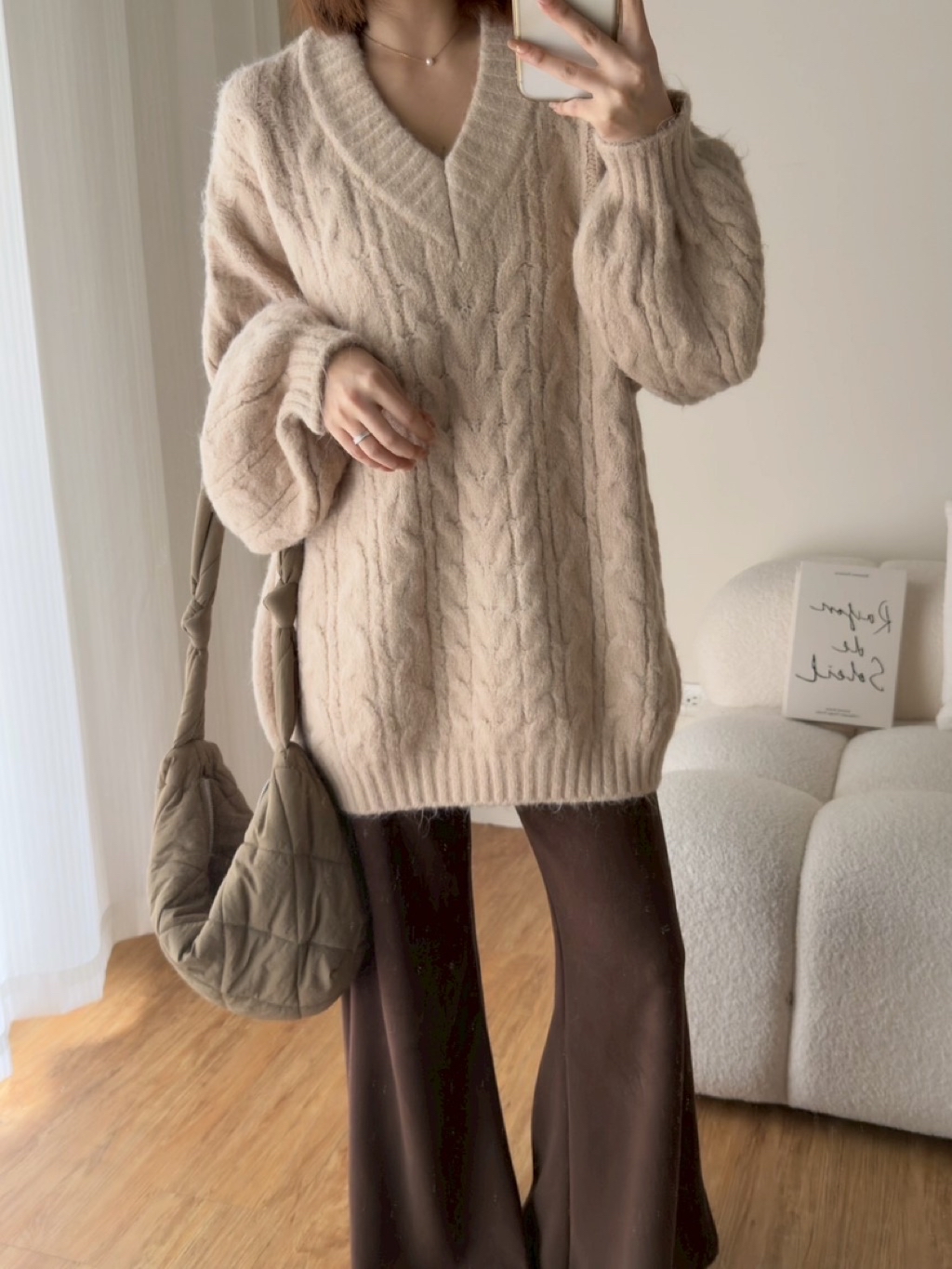 ʀ.ᴄʜ 大版花苞袖V領麻花毛衣
