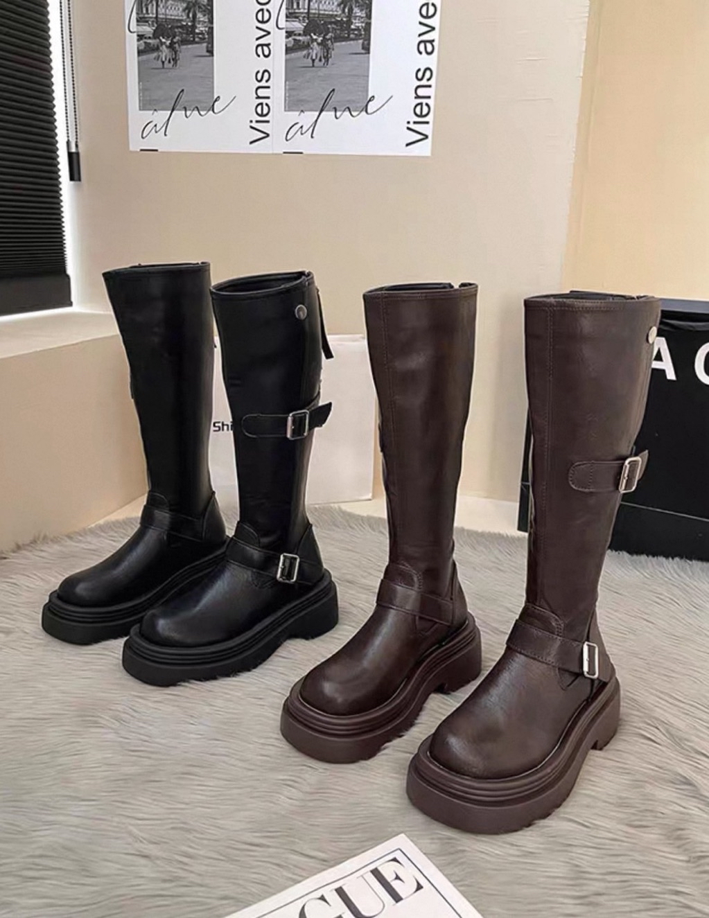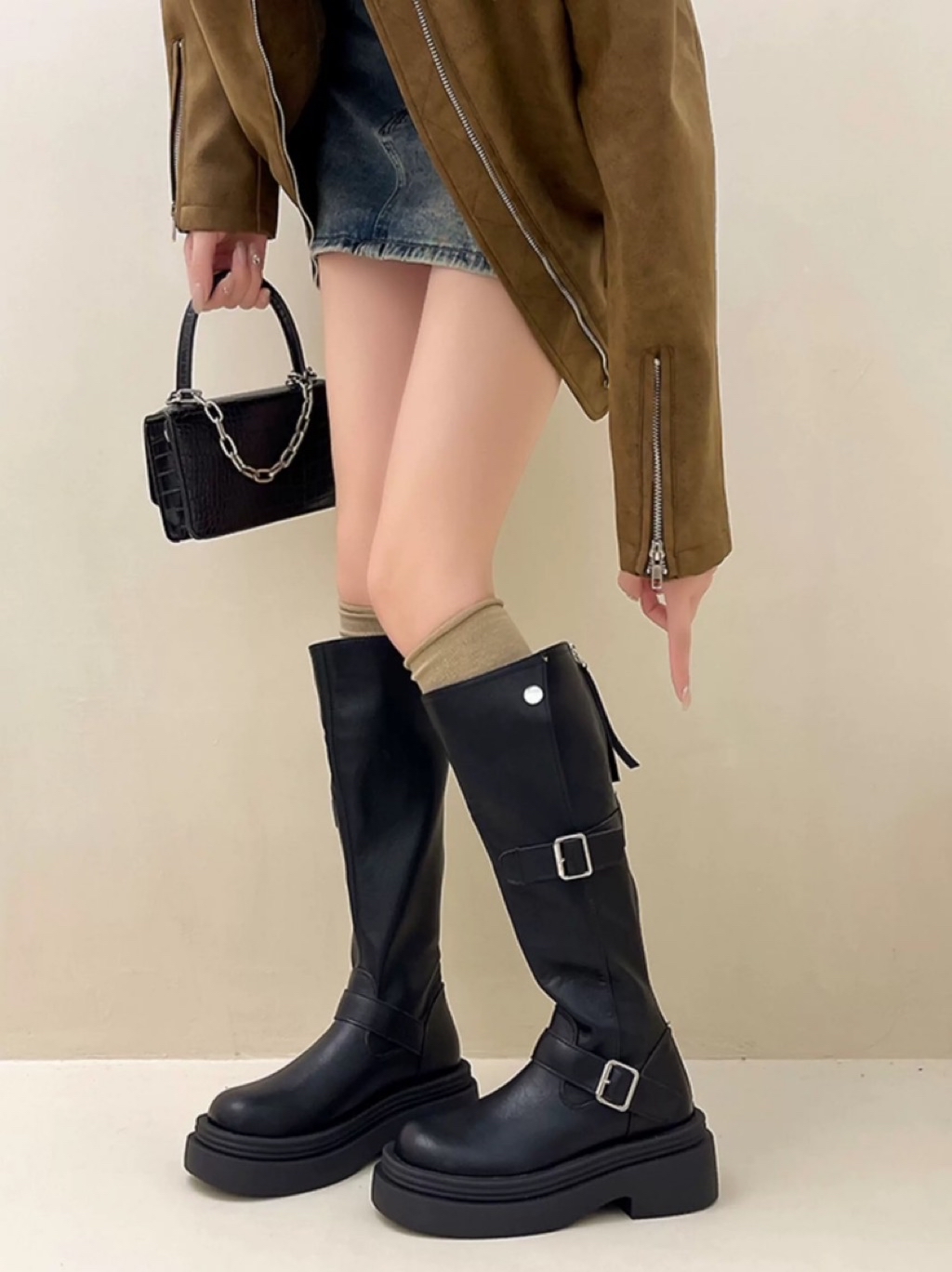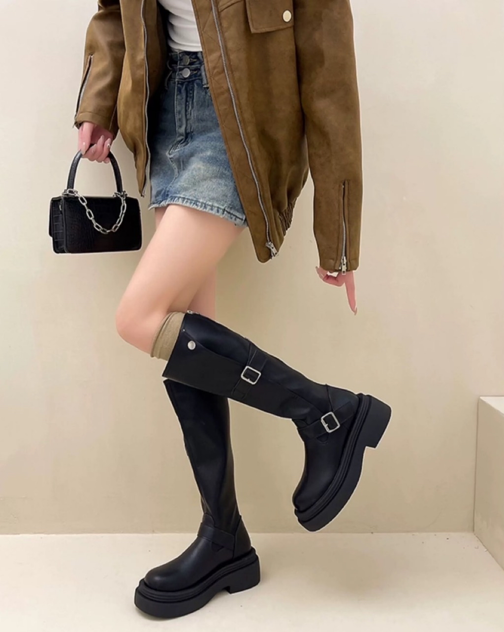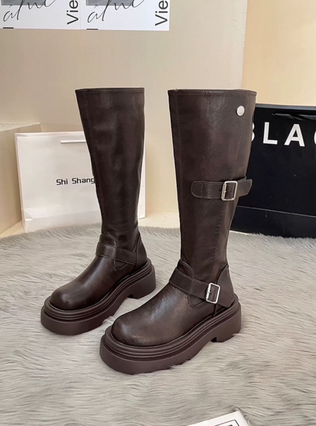 🇰🇷正韓復古英倫風皮帶釦後拉鏈增高厚底長靴
