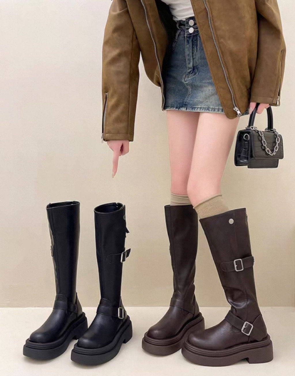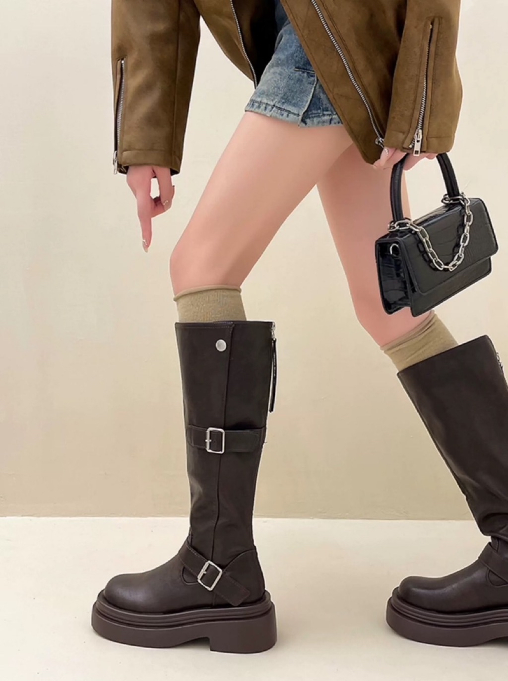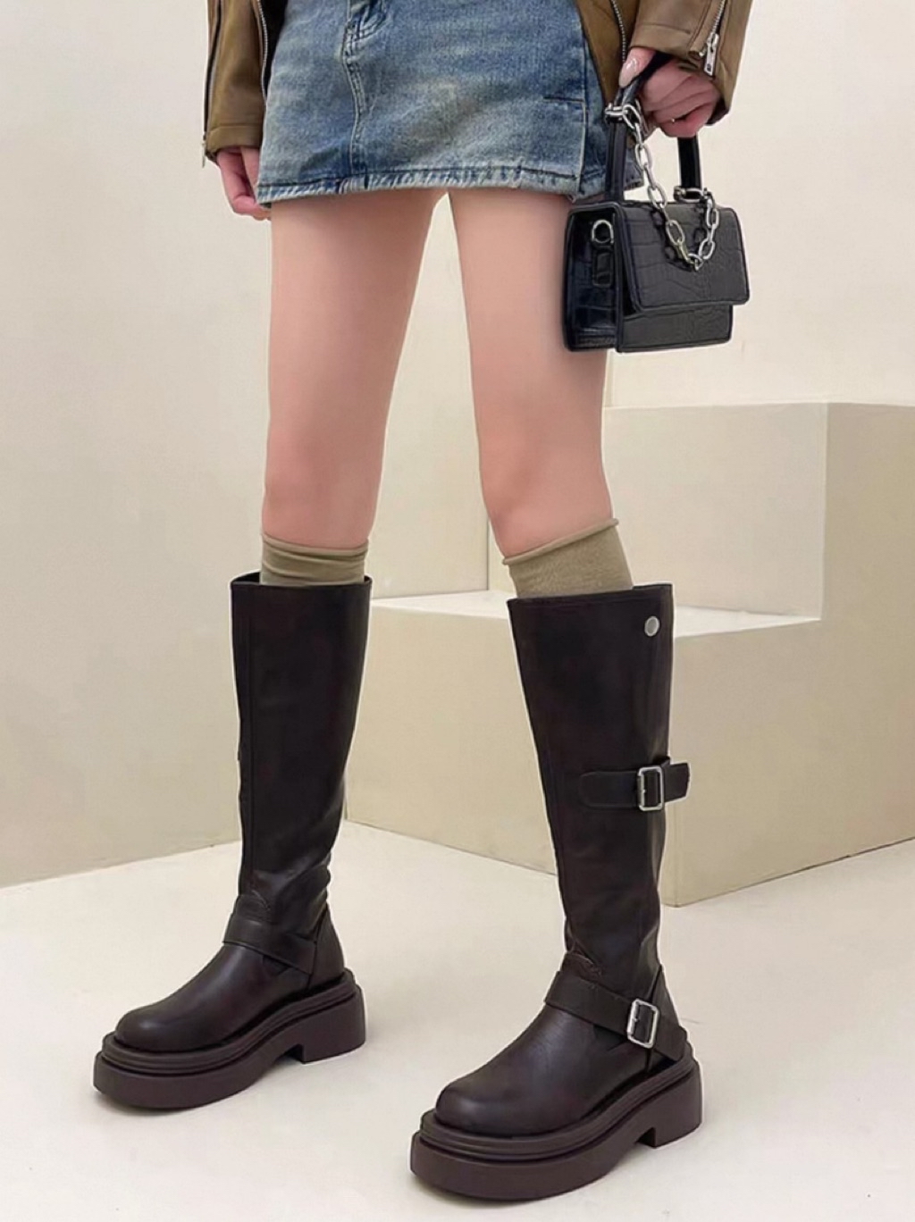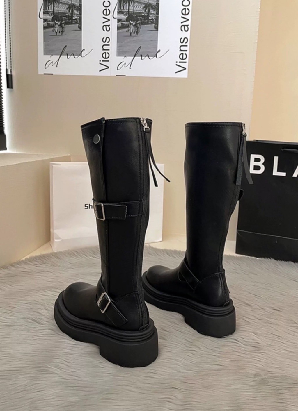 🇰🇷正韓復古英倫風皮帶釦後拉鏈增高厚底長靴