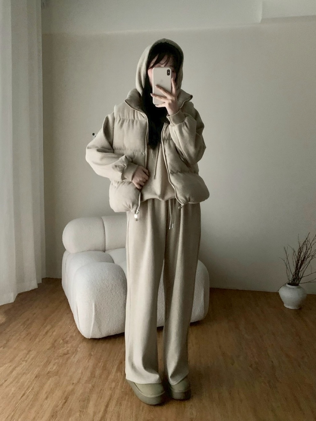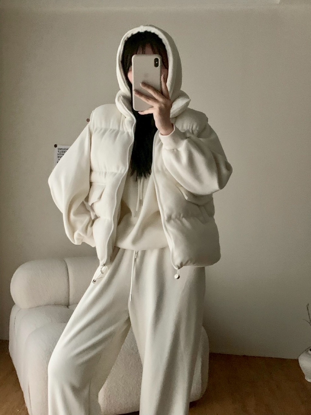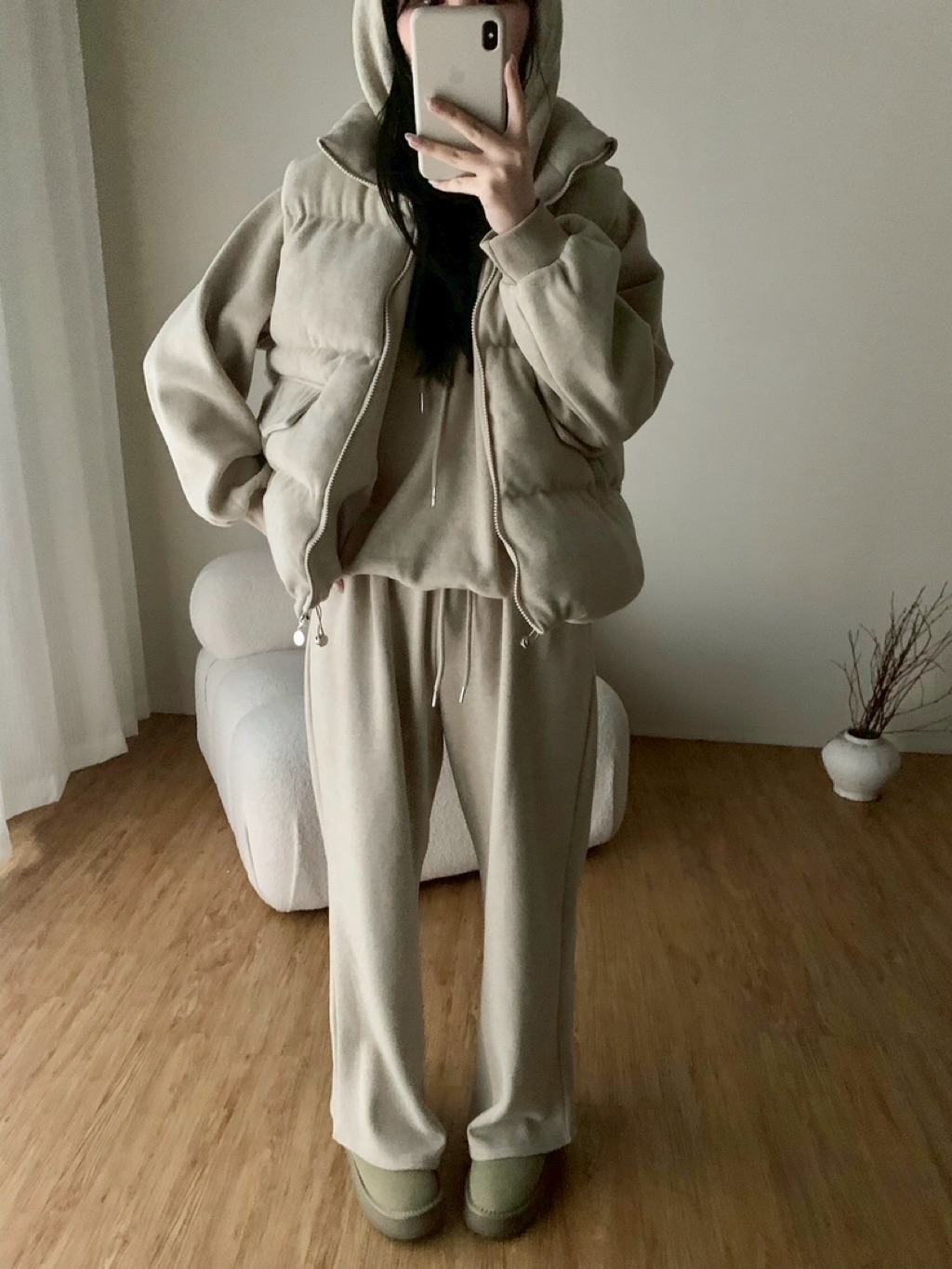✨New新款號:5476磨毛鋪棉背心➕連帽大T➕長褲三件套超高CP值🤍最近脆最紅的款🧡🧡🧡🧡火🔥熱登場顏色:灰、卡、粉、杏背心胸寬:60 衣長:60上衣胸寬:62 衣長:62長褲腰圍:34-53 臀圍:56 褲襠:33 褲長:100