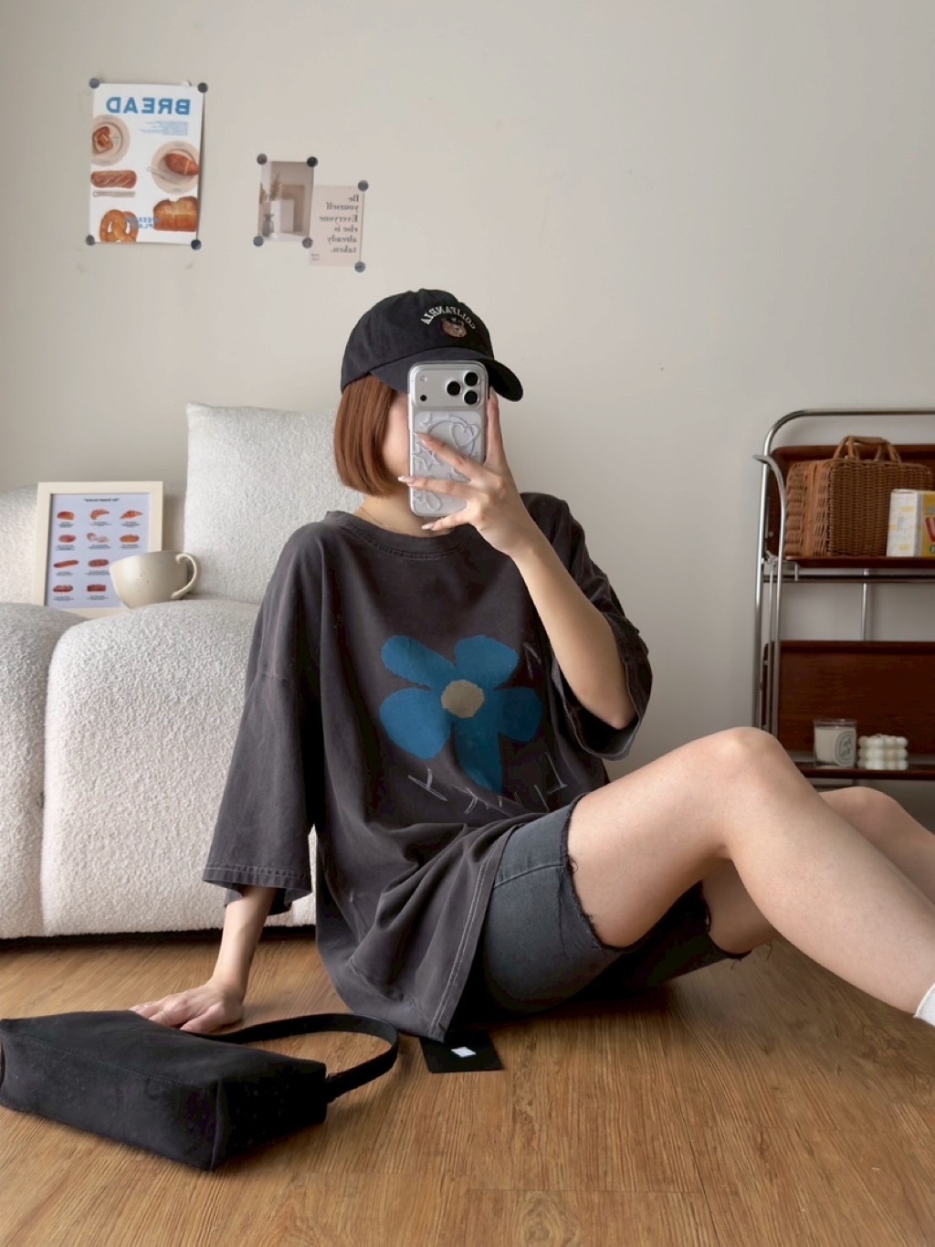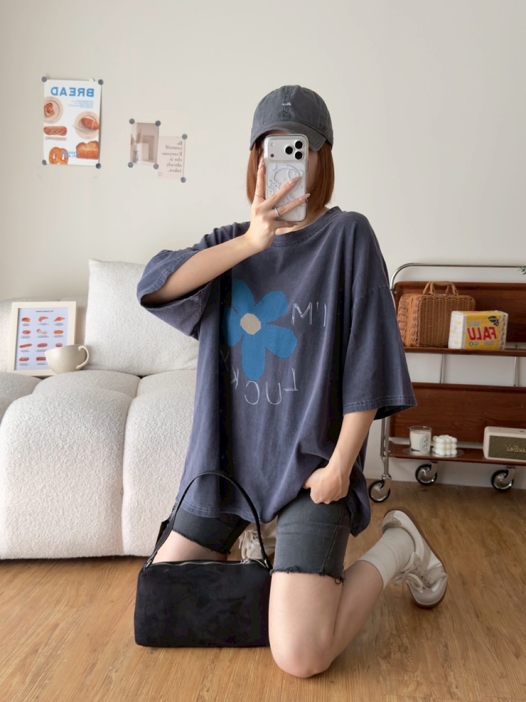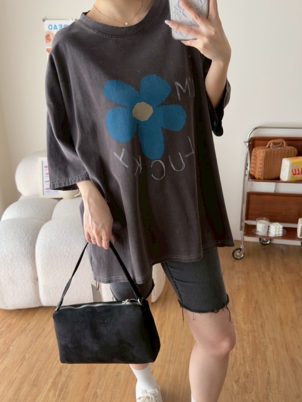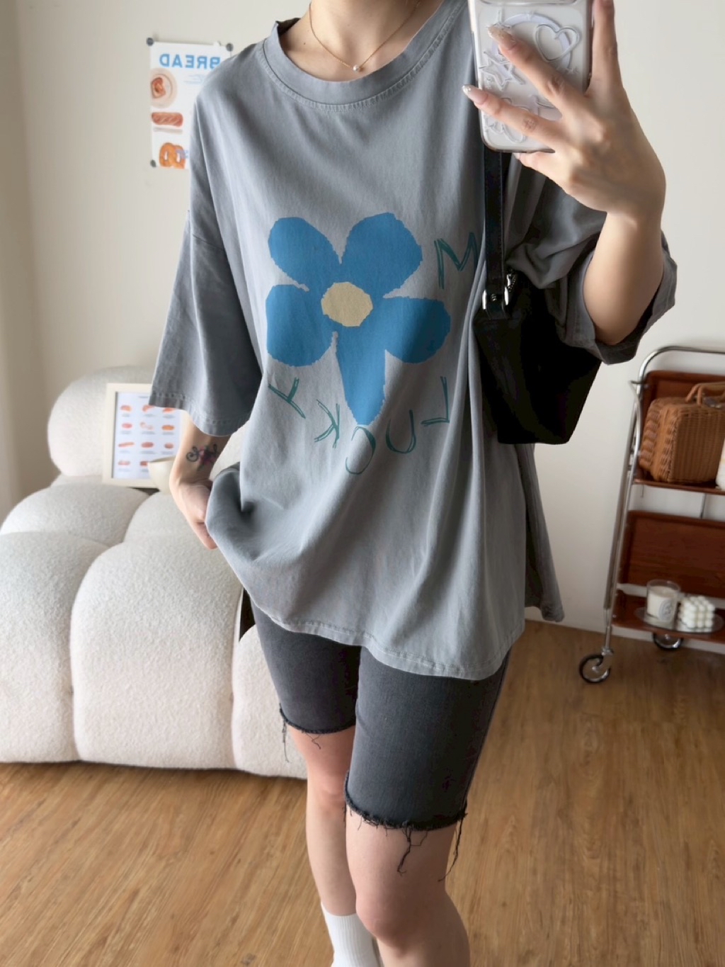 New新款號:6907◡̈ 春季新款搭配𝗼𝗼𝘁𝗱洗水面料花朵大T顏色:白、淺灰、藍、深灰胸寬:69 衣長:73