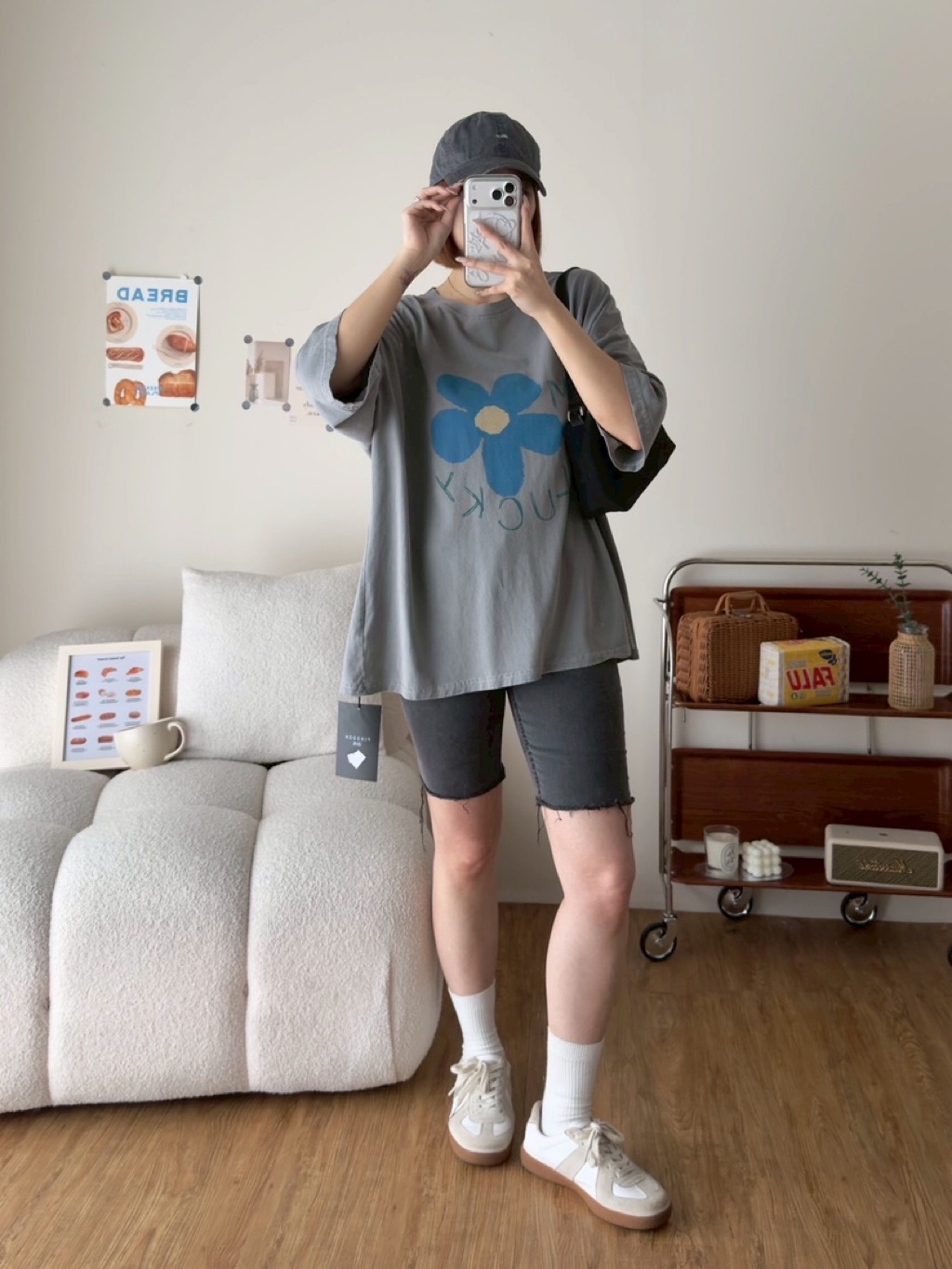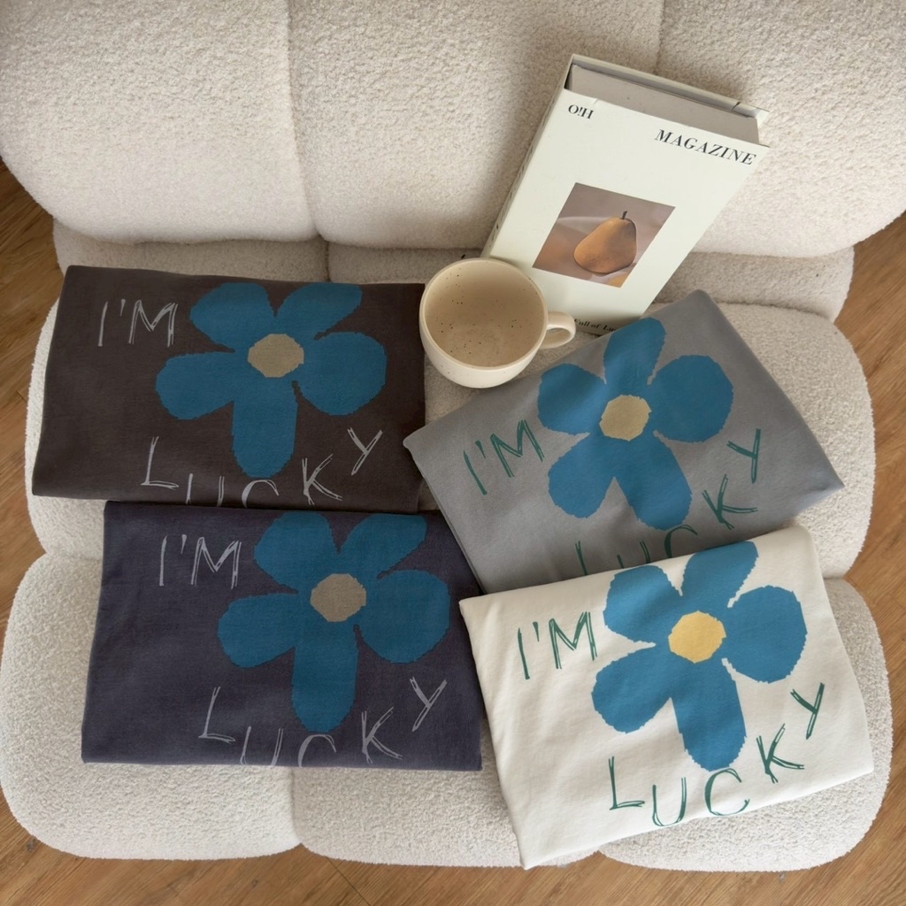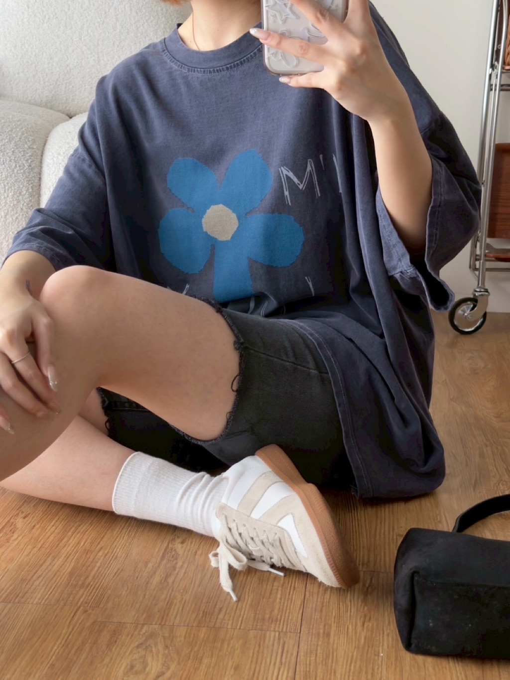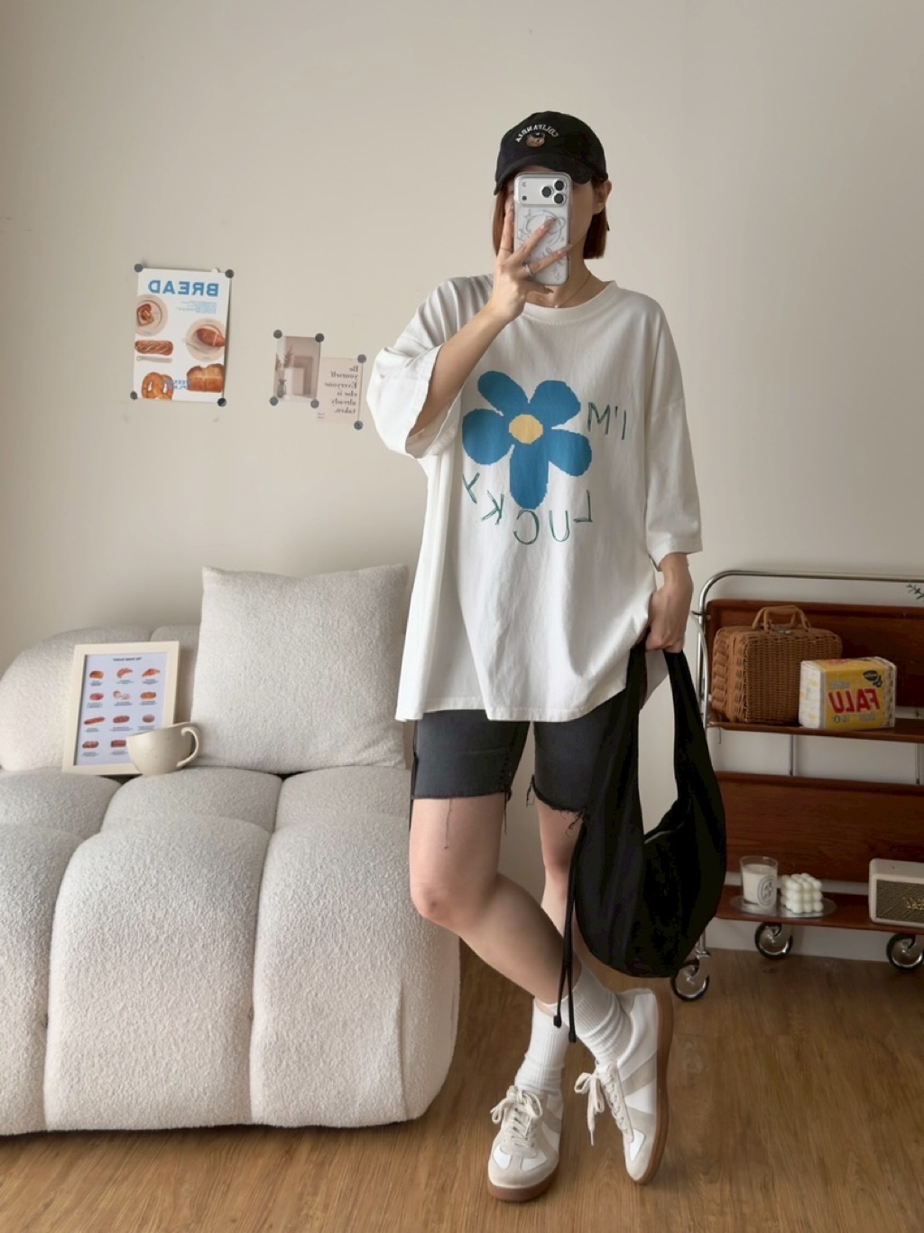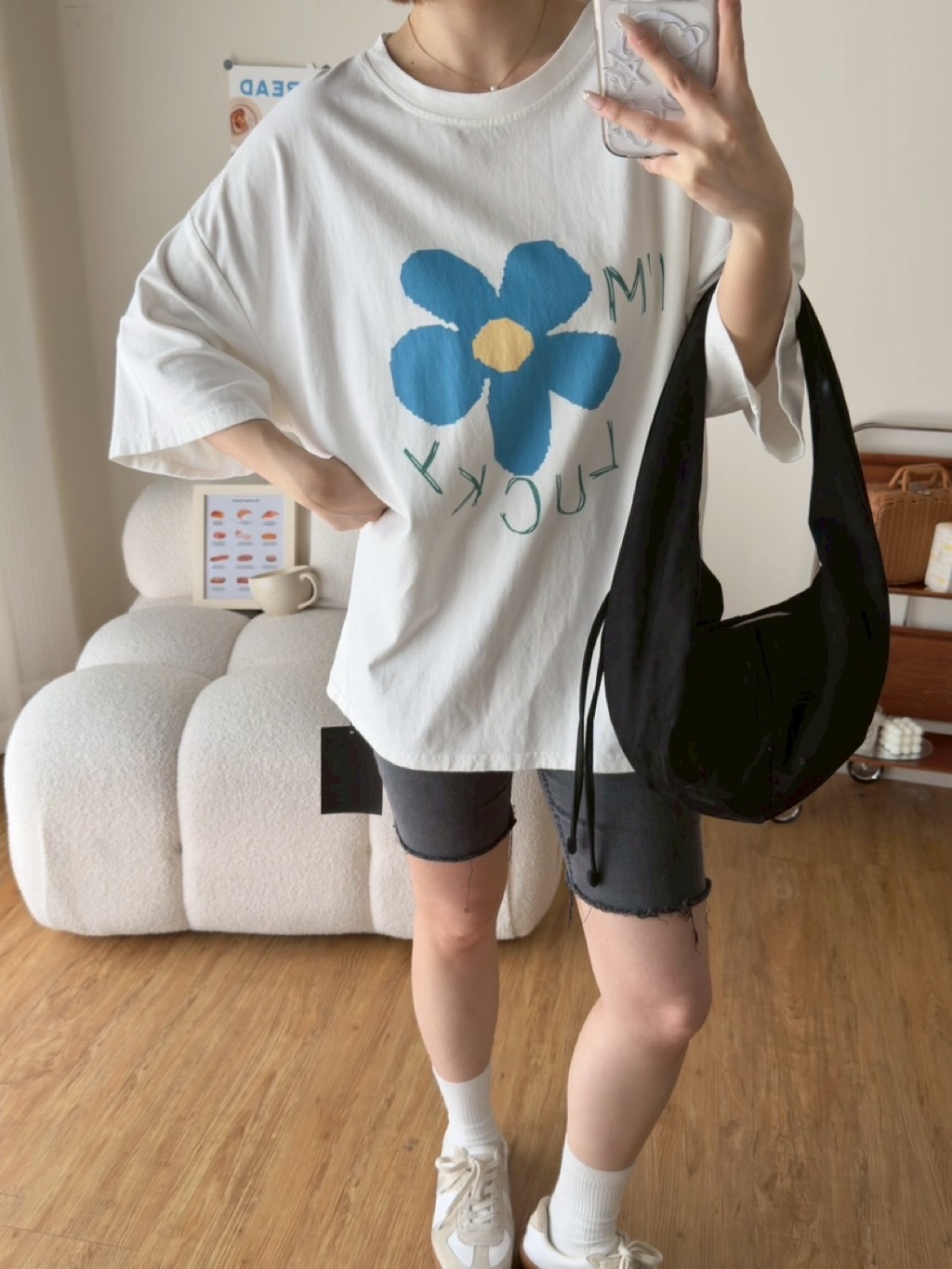New新款號:6907◡̈ 春季新款搭配𝗼𝗼𝘁𝗱洗水面料花朵大T顏色:白、淺灰、藍、深灰胸寬:69 衣長:73
